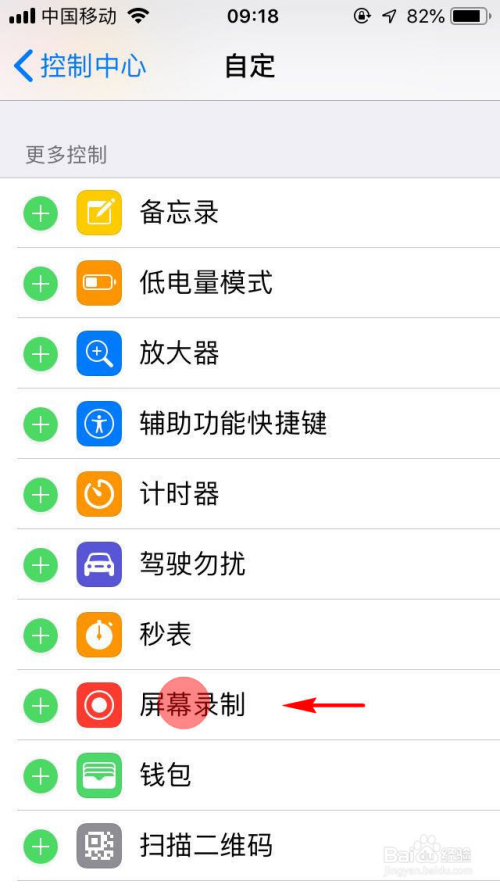 进入到自定控制后,我们在更多节制里找到屏幕录制功能。并点击前方的绿色小加号按钮,将它添加到包罗里。