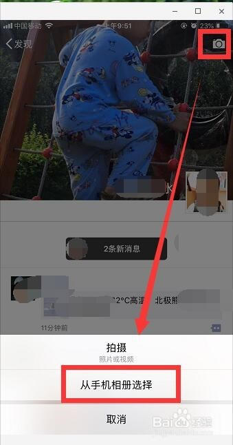 点击右上角的小相机图标,点击“从手机相册选择”。