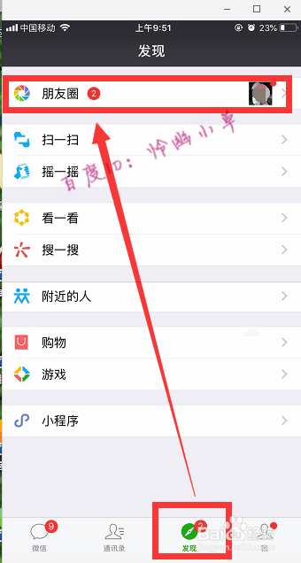 登录微信,点击“发现”→“朋友圈”。