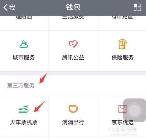 在钱包的页面里,选择第三方办事下的火车票机票,如下图。