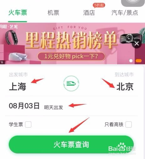 点击了火车票机票之后就会进入采办火车票的页面,我们选择好出发地目标地和时候。