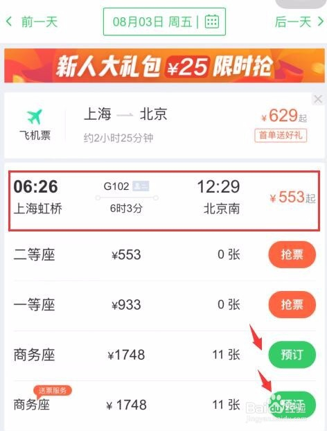 接着就会有具体的火车票的车次信息,选择本身想乘坐的车次点击预定酒店。