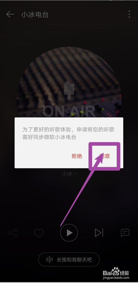 进入小冰电台提醒是否要同步微软小冰电台,点击【赞成】