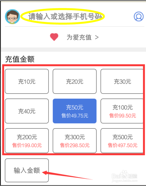 输入手机号,然后选择充值金额或者直接点击输入金额。