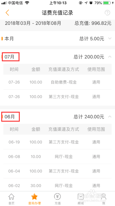 除查看当月的充值记实,还可以查询近半年的所有充值记实。