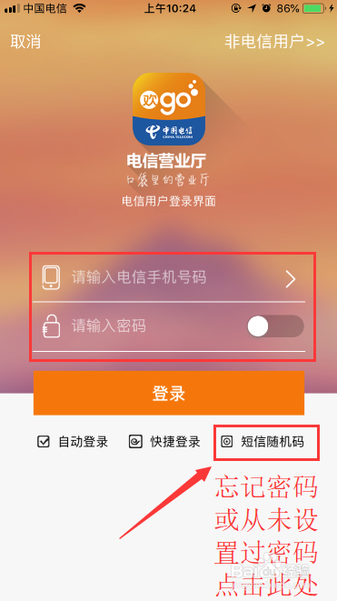 输入账号密码,如若健忘密码或从未设置过密码,选择“短信随机码”进行登录。