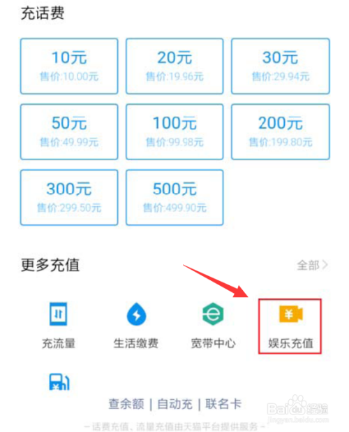 3.进入【充值中间】本家儿页面之后,在页面下方【更多充值】栏目中点击【娱乐充值】,如下图所示。