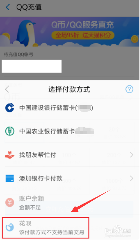1.当前2018版的付出宝是没有法子用付出宝的【花呗】来进行Q币充值的,如下图所示的提醒。