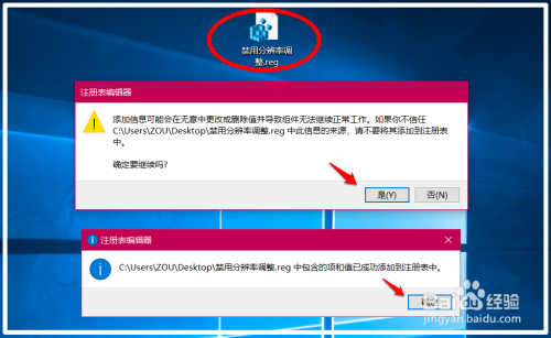 在系统桌面上我们找到并左键双击【禁用分辩率调整.reg】的注册表文件图标,在先后弹出的注册表编纂器对话框中点击:是(Y)和确定;