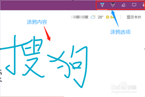 别的一个全新的功能就是“涂鸦”了,点击浏览器右上角的钢笔图标即可在当前网页里经由过程鼠标写字或者画画,如图所示...