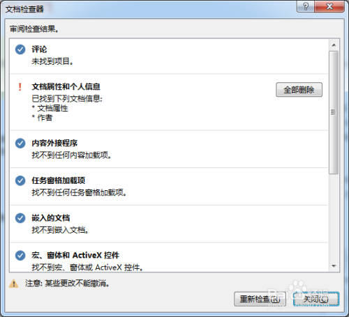 查抄文档会对所有文档中的内容进行查抄,若是没有保留会提醒保留,如下图。查抄的内容包罗批注、小我属性、外接法式法式、嵌入的文档等等很多信息。