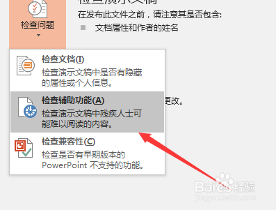 我们再来看一下查抄演示文稿中的三个功能,别离是查抄文档、查抄辅助功能、查抄兼容性。