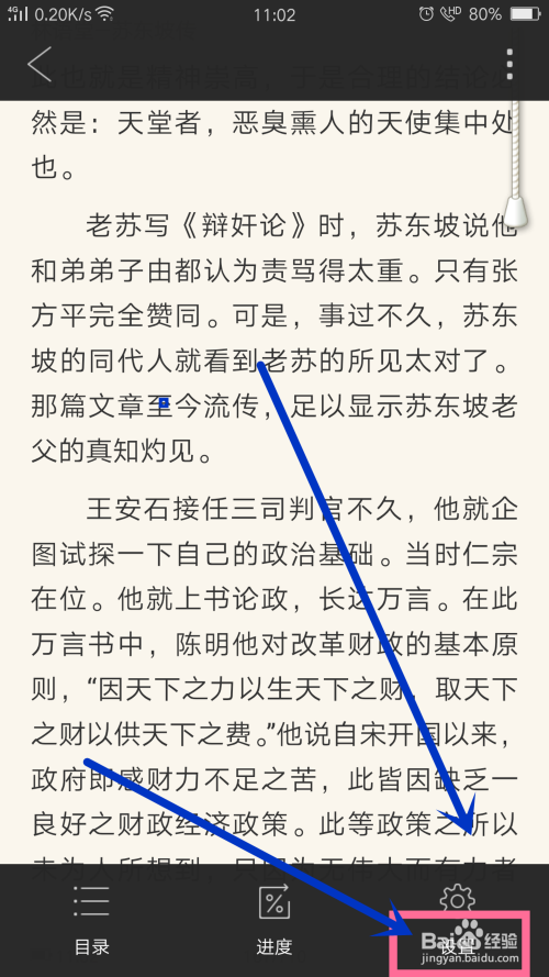 打开册本后,点击屏幕中心调出阅读设置菜单,进入设置,如图所示