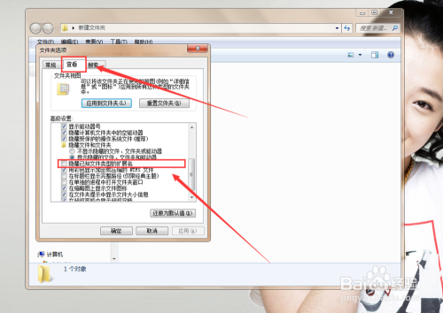 在弹出的窗口中点击“查看”,找到“埋没已知文件类型的扩展名”。将前面选矿的对号“√”去失落。点击“确定”