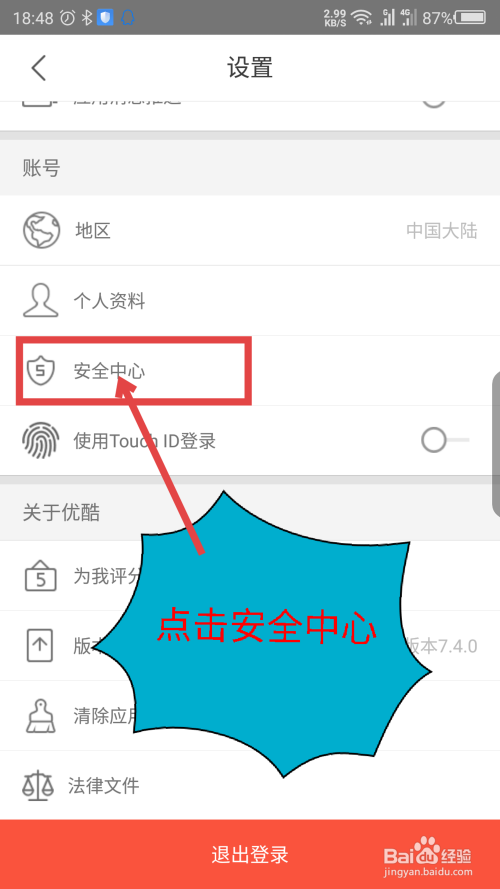 在平安设置界面,接近最下面有个账号刊出选项,在最下面的登录设备办理的上面,点击账号刊出。