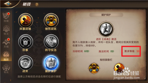 在秘技中可以看到总共有6个秘技,每个秘技的开启都是有品级限制的,到55级可以开启最后一个秘技。
