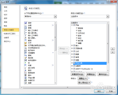 在“Excel选项”对话框里面点击【自界说功能区】,在右侧将【开辟东西】选上,然后点击【确定】。(若是东西栏上面已经有【开辟东西】,第四、五步就忽略失落)