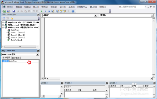 在“属性-模块1”里面将“模块1”重定名为“AotoTime”。(对于2007及之前的版本,模块的定名最好是不要利用中文,以免再次打开时犯错)