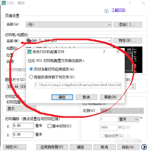 点击打印机名称后面下拉框,选择“DWG To PDF.pc3",也就是选择打印当作PDF。