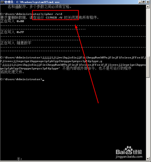 如我们要察除U盘上的残剩空间数据,U盘的盘符为D,我们在号令提醒符切换到D盘,并输入以下号令:cipher /w:d