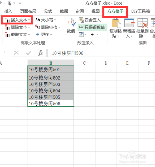 1.首先在电脑上安装excel,打开一个有文本内容的excel文件,单位格里面只稀有字【10号楼房间501】到【10号楼房间506】这几个数字,如下所示。