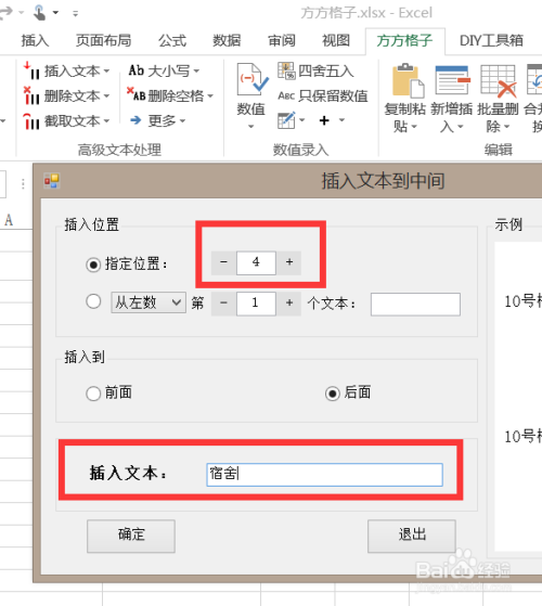 5.这时辰主动弹出一个新的对话框【插入文本到中心】,先在【指定位置】的【插入位置】那边点击右边+号调到4,再在【插入文本】那边输入【宿舍】这两个字,如下图所示。