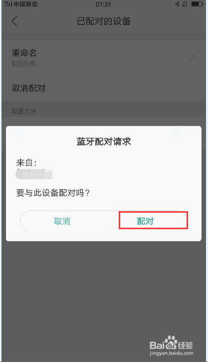 此刻手机一和手机二进行蓝牙配对操作,手机二进行点击毗连配对;如图。