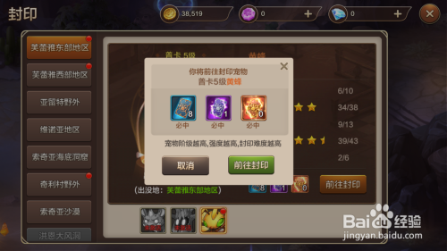 接着进入封印的设置界面,这里是选择宠物的的分布地域,每个地域的宠物种类也是纷歧样的,你想要捕获的宠物在什么地域就点击左侧的地域位置选项。