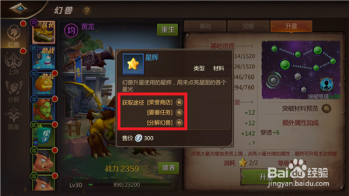 幻兽的升星是需要耗损星辉材料的,每次升星需要耗损一个,星辉的获取路子可以经由过程声誉商铺、幻兽分化等。
