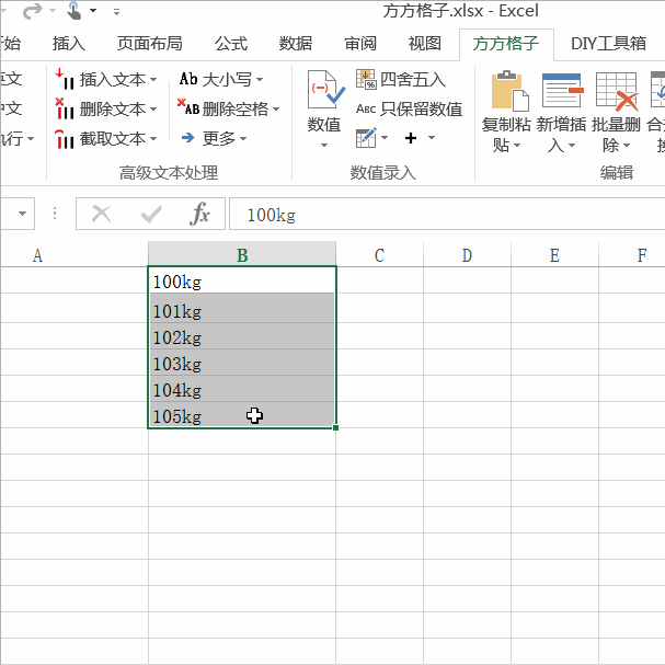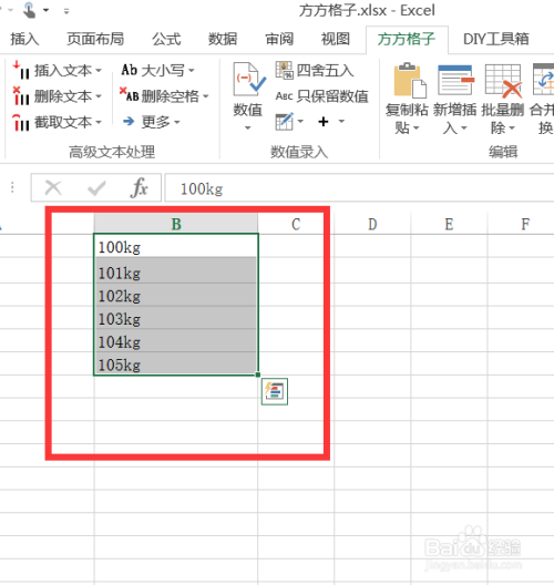 1.在电脑先安装好excel,并打开一个excel文件,单位格里面只稀有字【100kg】到【105kg】这几个数字,如下图所示。