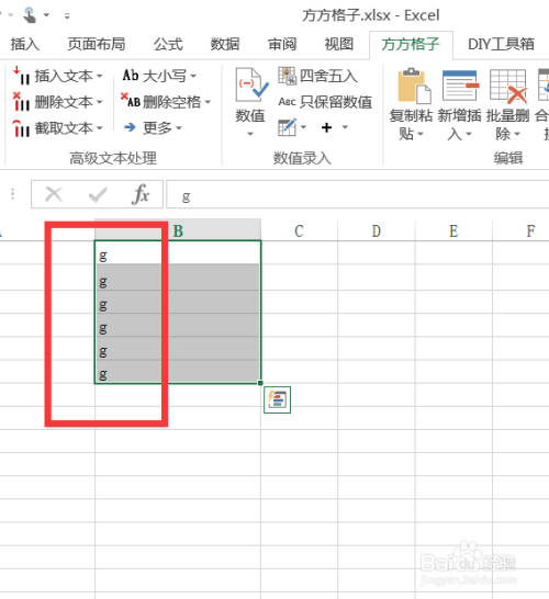 6.点击【确定】按钮之后,即可看到最终结果,就是所有选中的单位格五个字酿成一个字【g】,如下图所示。
