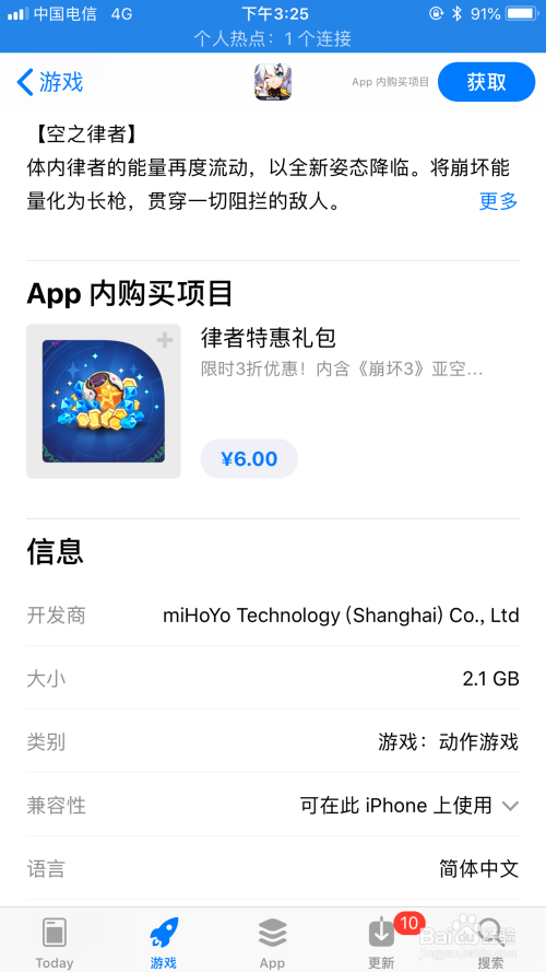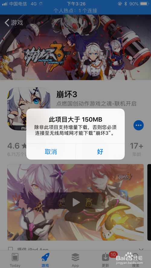 第一步我们点击想下载的软件,它会跳出150mb的限制。点击好,然后在继续下载他就会有一个进度条,等你毗连WiFi时主动下载。