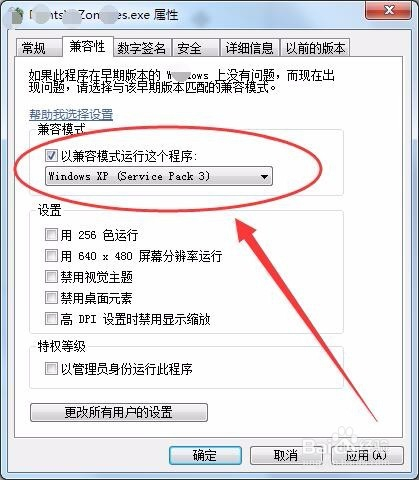 兼容性选项卡中,选择以兼容模式运行这个法式选项。