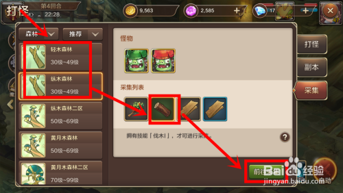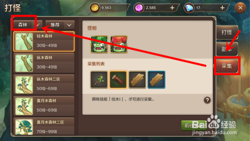 在打怪窗口中,点击右侧的“采集”按钮,然后选择左侧第一个下拉框为“丛林”。