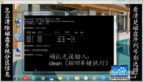 首先,要注重这个操作必然要谨严,别选错了磁盘(因为这里不显示盘符,只显示序列号),不然就是将需要的磁盘中的信息也全数清理清洁!