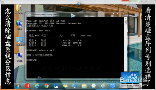 select disk 盘符(看清晰要选择的磁盘序列号,别选择错了!)→按回车键执行号令(号令之间有空格)。