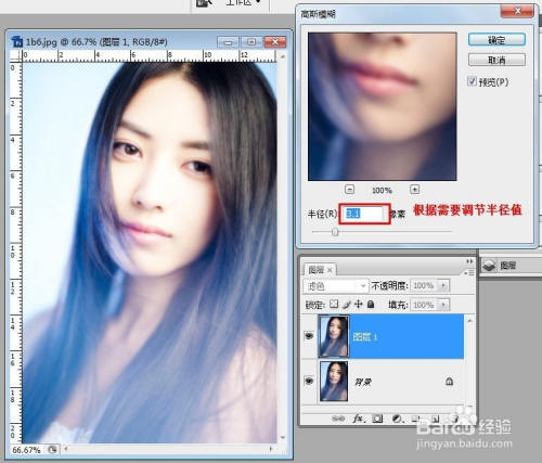 执行“滤镜-恍惚-高斯恍惚”,在高斯恍惚窗口参考照片的转变调节半径的值,然后点确定就可以了。(注重:半径的大小要按照你想要达到的结果而定)