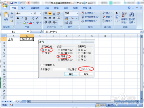若是我们想在表格的行里面填充日期,按照上述操作,在序列对话框中,序列发生在【行】即可,其他选项同上面一样。