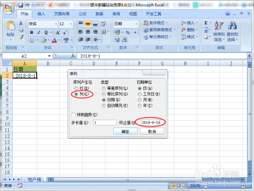 弹出序列对话框,我们依次在各项选项中选择【列】、【日期】、【日】,在终止值输入日期的最后一个日期,输入完毕后,再点击【确定】