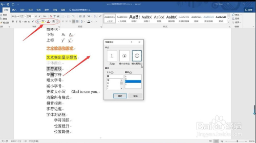 下面是关于设置文本结果和版式,我们先选择,然后再进行设置,在这里面的一些文本结果是我们word傍边已经设置好的一些格局,我们可以直接引用就可以了。里面还有其他的设置,好比说我们可以改变它的轮廓颜色,还可以改变他的这个意标的目的样式,发光结果我们本身可以按照需要进行设置。点这个按钮可以实现荧光这个功能,这个功能就是说我们可以将我们选择的文字凸起显示出来就像是用荧光笔,如许涂了一下一样,让文字更凸起。这里需要注重:带圈文字得一个字一个字来进行设置。