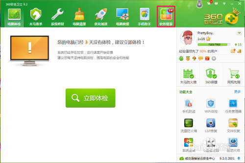 软件管家有好几种,不外利用方式都年夜同小异,这里就以360软件管家为例。首先打开360安全卫士,然后选择软件管家。