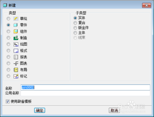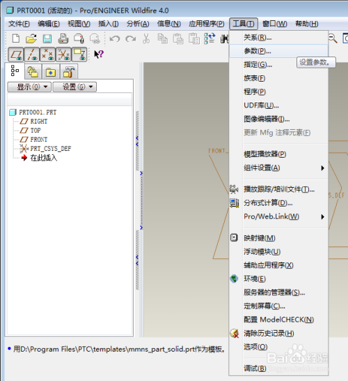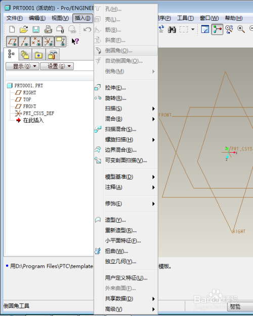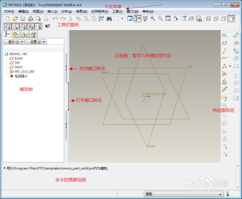 点击新建零件,可看熟悉PRO/E的各个构成部门,功能菜单栏,画图区,模子树,号令展示栏,东西栏等
