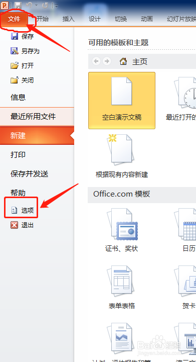 首先打开一个空白的PPT,点击菜单栏“文件”,找到“选项”,点击进入;