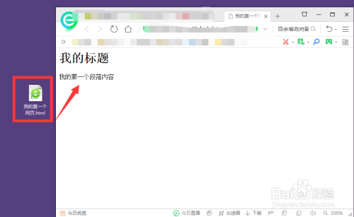 最后保留后,记事本图标就变为了网页图标,双击打开后,就打开了一个网页,就可以看到适才本身的h1和p标签内容了。如图所示