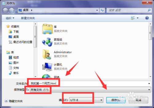 在另存为选项设置中,设置文件名为.html结从头至尾,保留类型选择为所有文件,最后的编码则选择为utf-8,utf-8又称为万国码,全国通用。