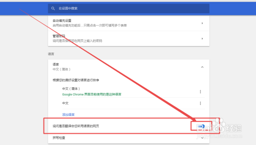 然后点击 扣问是否翻译非您所用说话的网页 这个选项后面的滑动图标,将它开启。