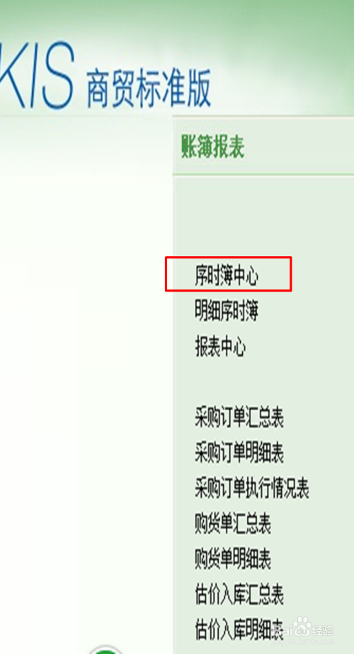 同样进步前辈入到采购本家儿菜单页面,然后在最右侧的账簿报表列表中单击【序时簿中间】。