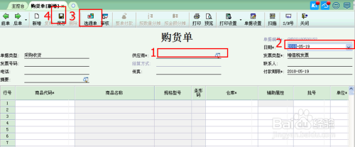 进入收货单页面今后在图示1位置填写供给商信息,在位置2处选择收货日期,位置3处选择采购所下原单,并按照送货单上信息填写数目物料规格等信息,最后点击位置4的保留。