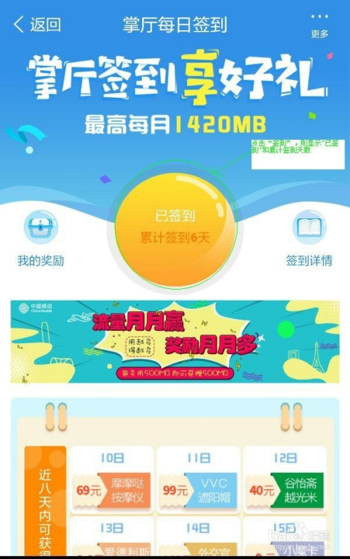 用户累计签到天数决议了可获取的流量大小和获取的优惠券。累计签到20天可获取300MB流量,详情如图所示。