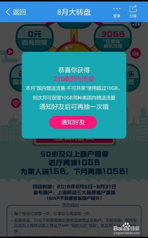 - 玩转年夜转盘抽奖活动有用时候:8月6日至8月31日,本月利用或曾流量跨越10GB,下月可再获得10GB流量